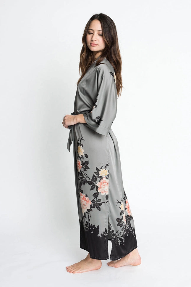 The KIM+ONO Blush Rose Women's Long Kimono Robe is wearable art, blending timeless tradition with modern elegance. Designed with a flowing ankle-length drape, this robe features a striking floral motif of soft blossoms set against bold black leaves. Along the hem, the leaves cascade into a deep band of black, creating contrast that makes the colors stand out even more. Lightweight yet luxurious, its silky charmeuse fabric moves beautifully with you, offering comfort that feels as refined as it looks.