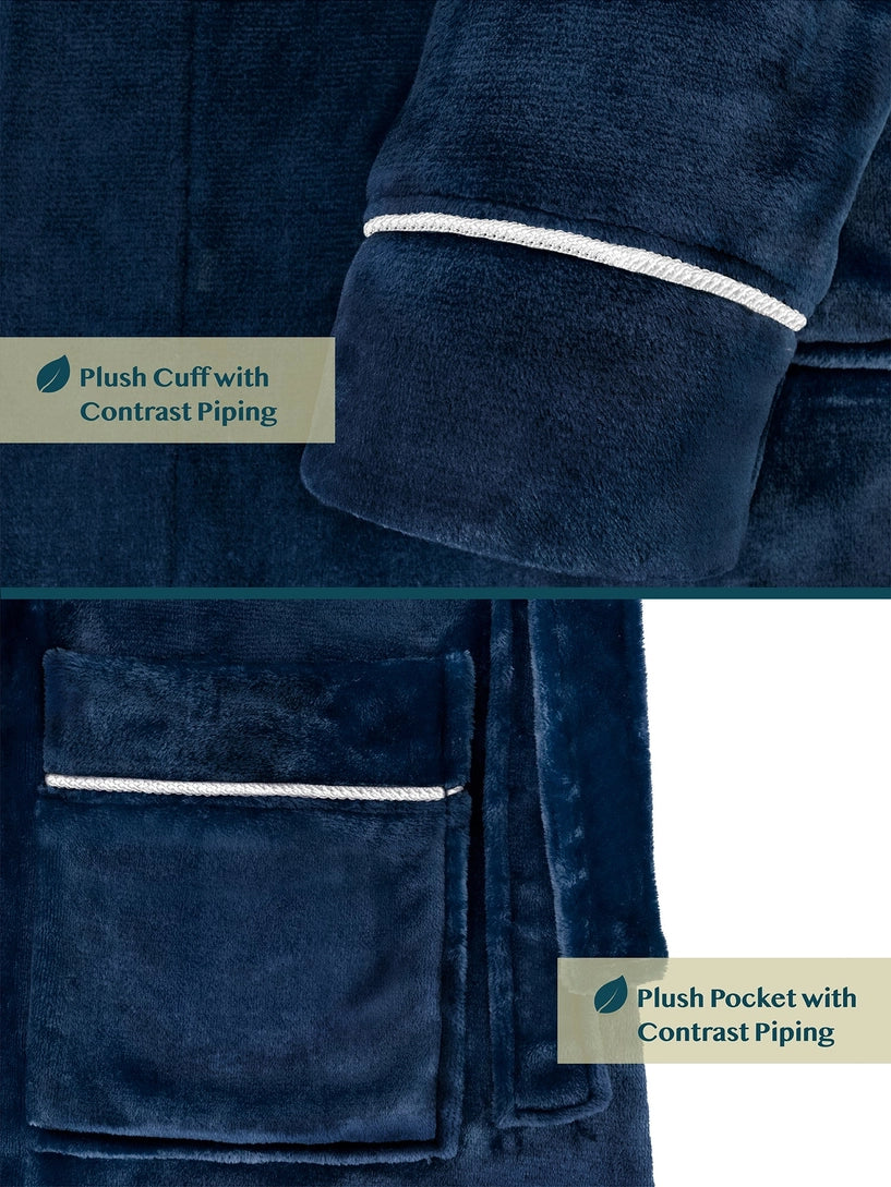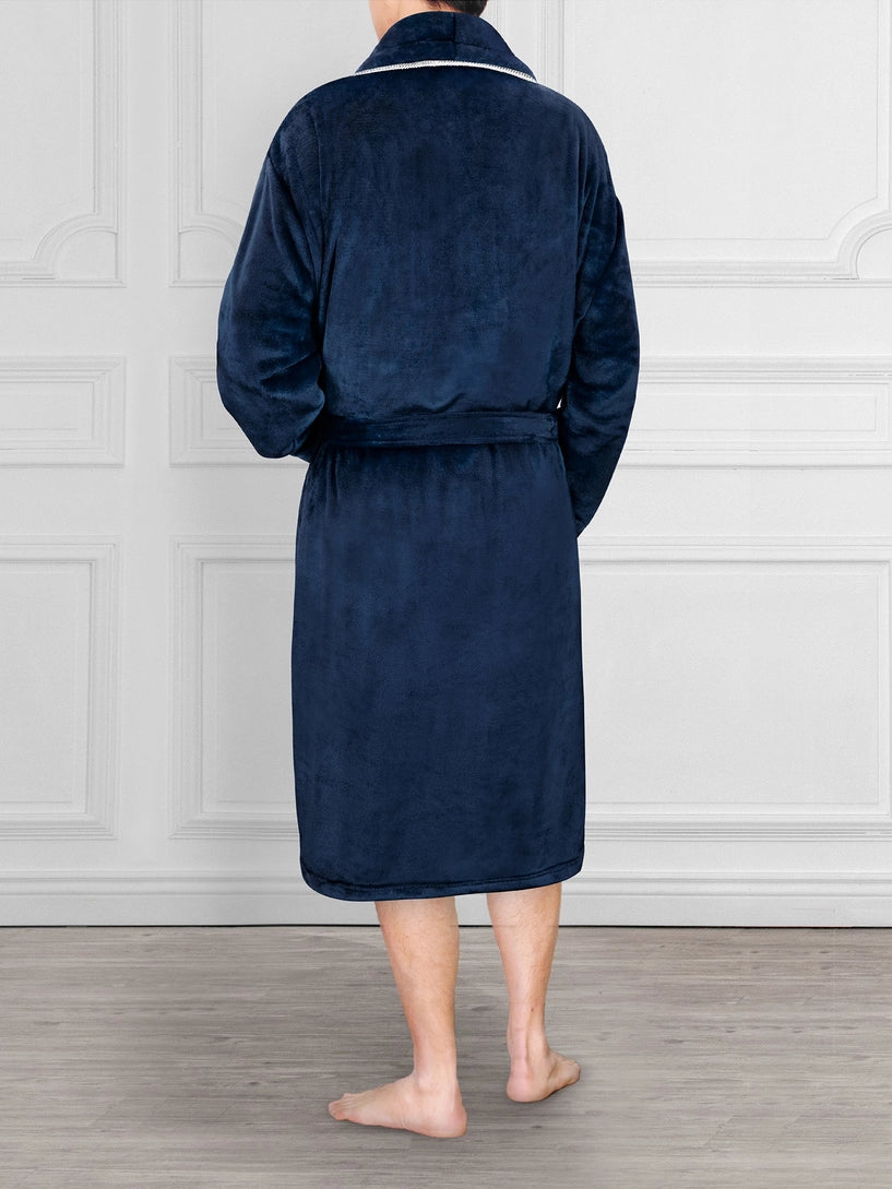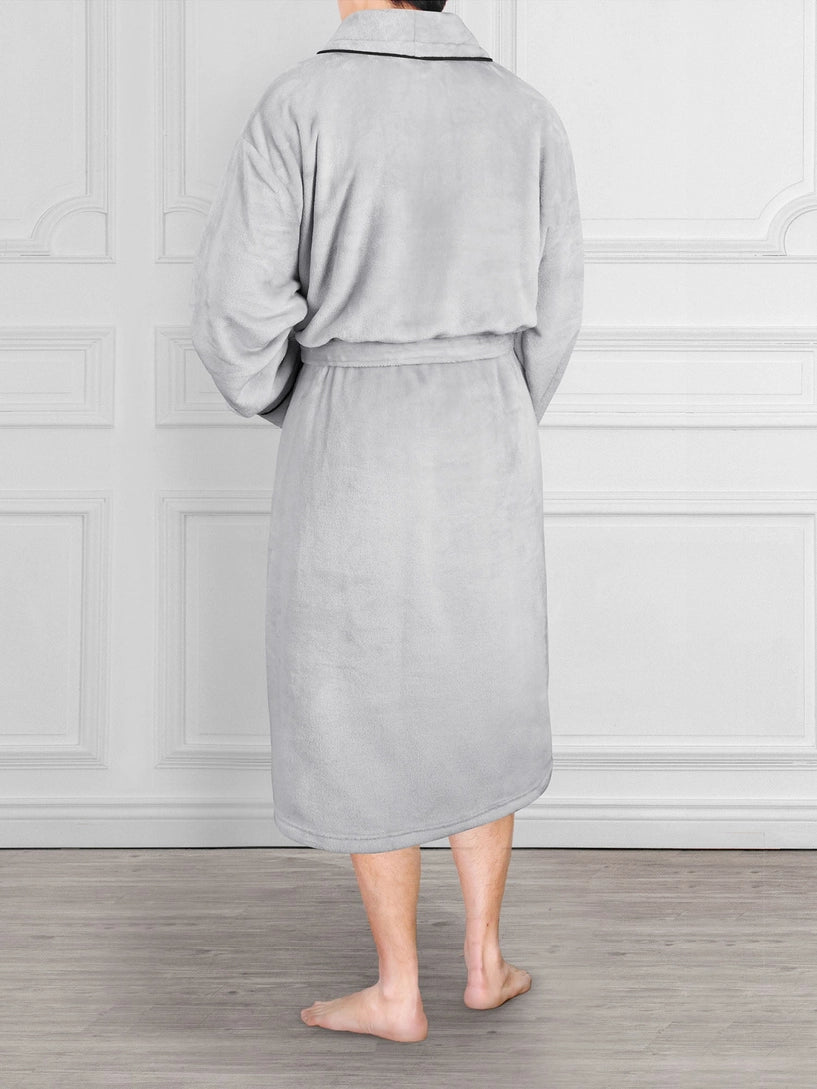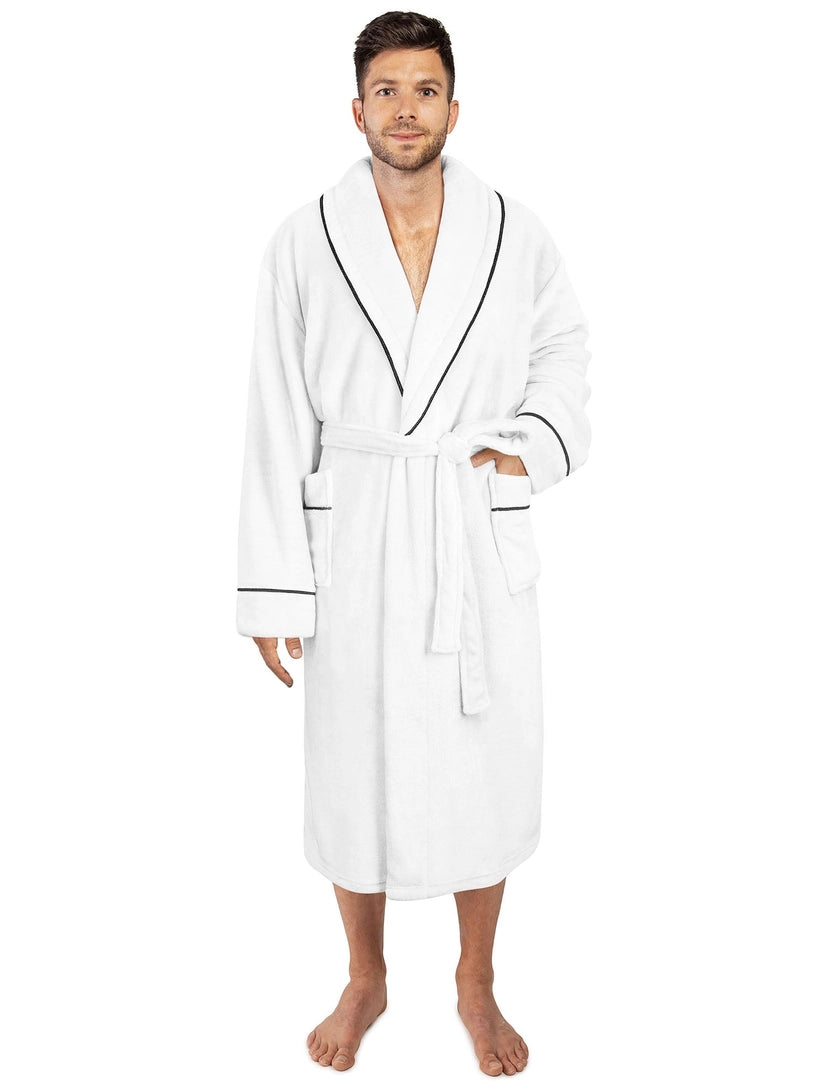 What sets this robe apart is its contrast piping — a crisp stripe outlining the collar, cuffs, and pocket edges — adding a touch of refinement to its cozy design. Whether unwinding after a long day, lounging on a weekend morning, or stepping out of the shower, this robe is a versatile staple. It also makes a thoughtful and practical gift for any man who values comfort with a polished look.