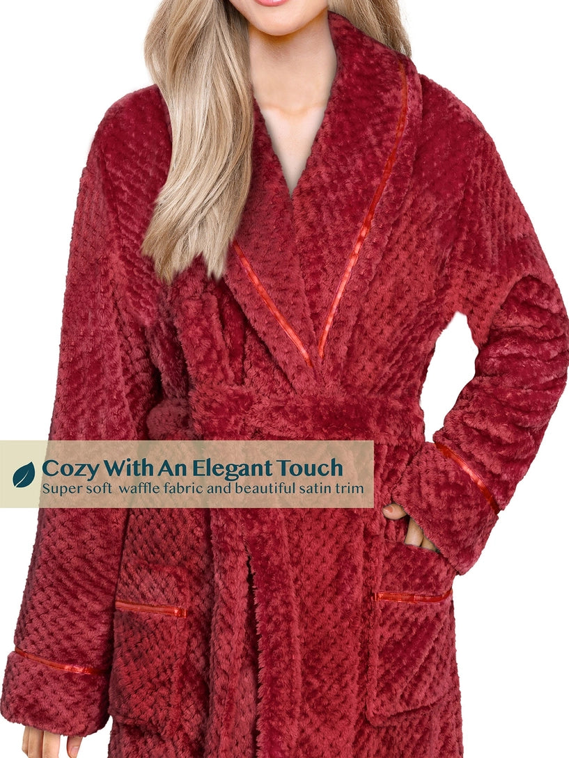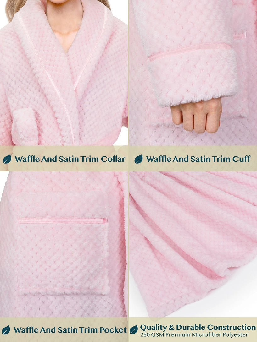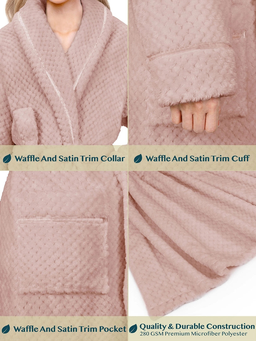 Elevate everyday comfort with the Pavilia Waffle Textured Satin Trim Fleece Women’s Robe, a cozy essential designed to feel as stylish as it is soft. Crafted from plush waffle-textured fleece, this robe wraps you in warmth while offering a unique, refined look that stands out from ordinary fleece robes. Its midweight design makes it perfect for mornings with coffee, evenings on the couch, or winding down after a bath.